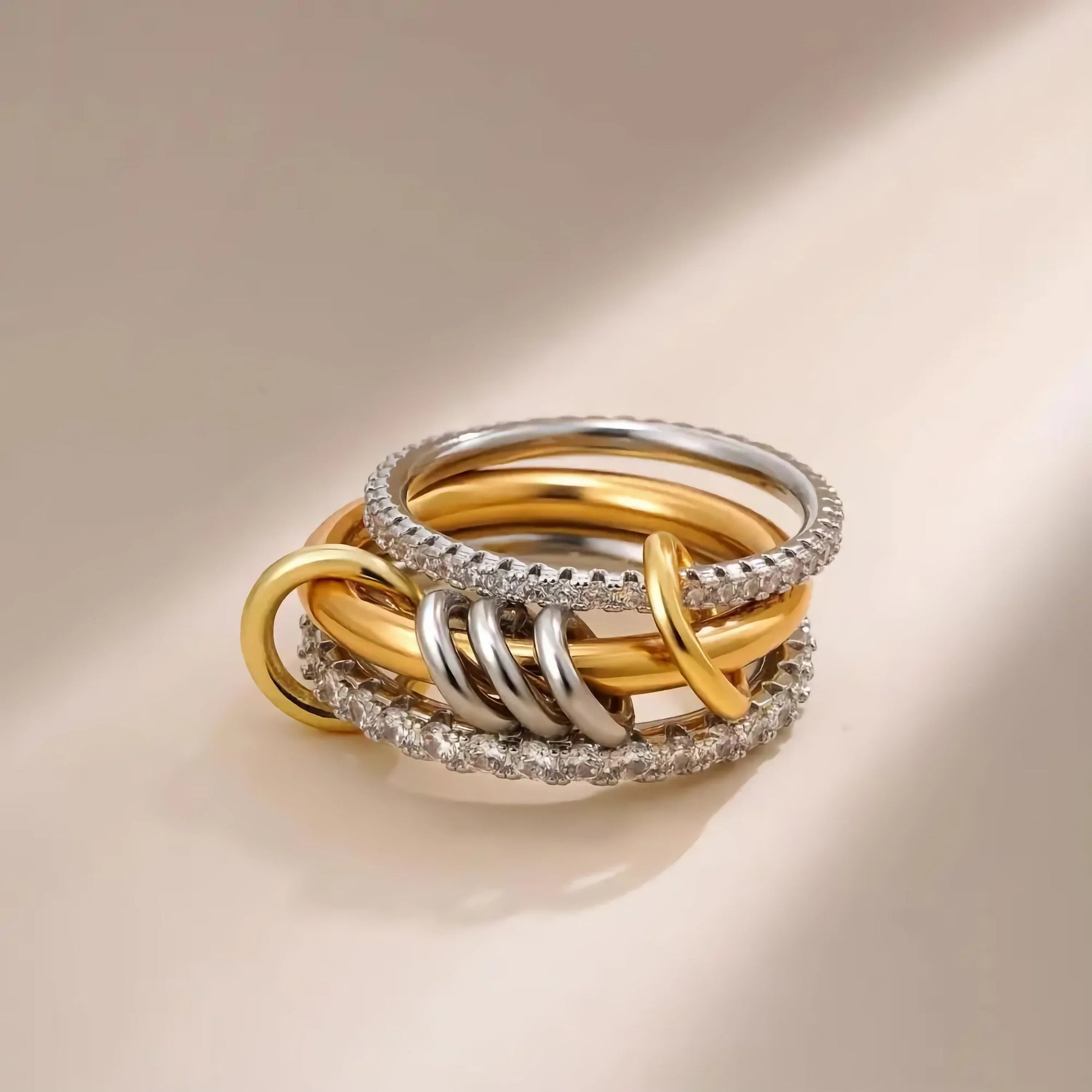 Avaria’s Cosette stands out with radiant pavé diamonds set across bands of gold and silver. The stacked design offers both dimension and light-catching brilliance in one effortless ring.